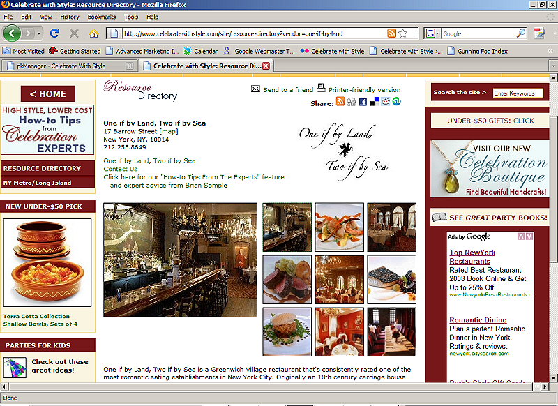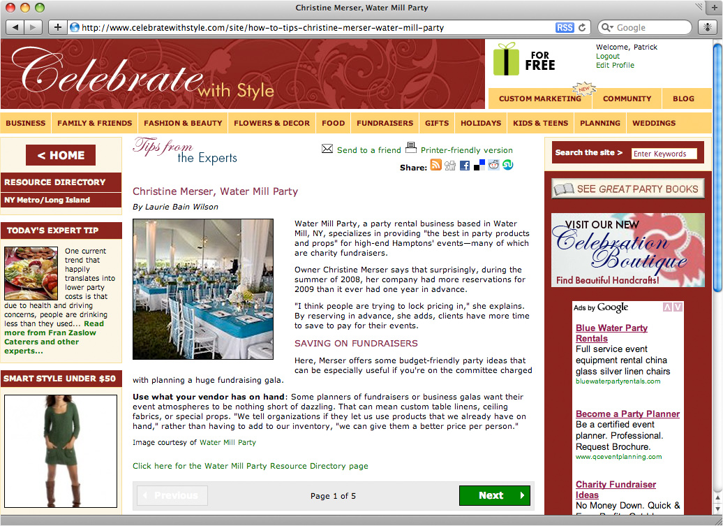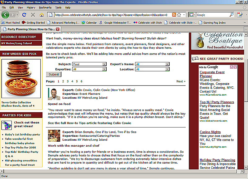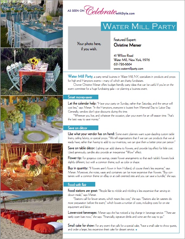 Your feature also will be presented on its own pages on CelebratewithStyle.com right now and on other sites in our growing network, in the near future. The online version will be identified as part of a sponsored program designed to let event experts introduce themselves to people planning all types of special-occasion parties and events. More important, the feature will be indexed by both your name and your company name, which may dramatically increase your presence and rankings on search engines.