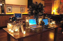 Blue Christmas ornaments filled glass vases, while votives and floating candles drew attention not only to the glimmering ornaments, but also to the blue screens of the computers, sitting on glass and standing out as decorative focal points.]